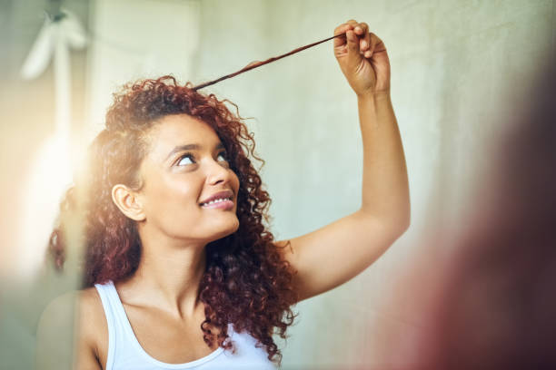 Cropped shot of a woman holding up a strand of hair in her bathroom at home